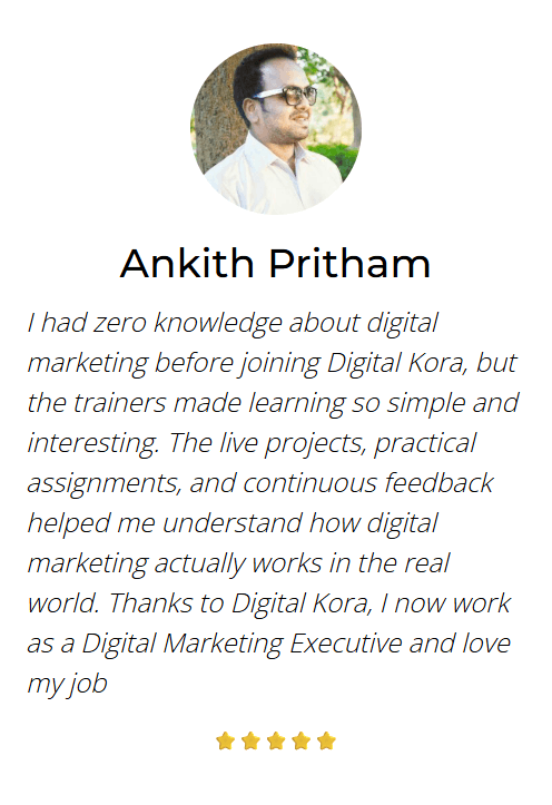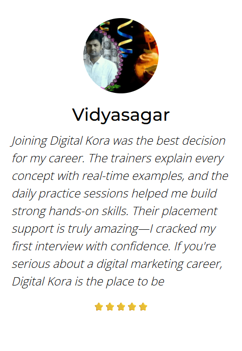Joining Digital Kora was the best decision for my career. The trainers explain every concept with real-time examples, and the daily practice sessions helped me build strong hands-on skills. Their placement support is truly amazing—I cracked my first interview with confidence. If you're serious about a digital marketing career, Digital Kora is the place to be