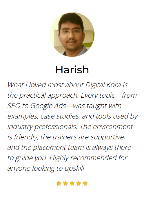 What I loved most about Digital Kora is the practical approach. Every topic—from SEO to Google Ads—was taught with examples, case studies, and tools used by industry professionals. The environment is friendly, the trainers are supportive, and the placement team is always there to guide you. Highly recommended for anyone looking to upskill